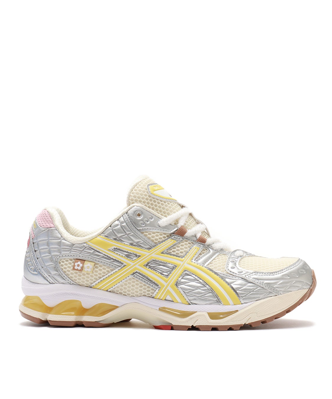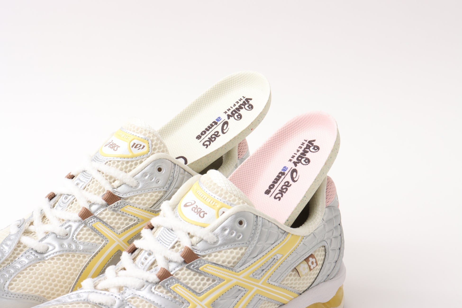 デザインは、アップカミングな「VANDYTHEPINK」が監修し、キュートなスタイルでアレンジ。ポップカルチャーを意識した「VANDYTHEPINK」らしいテーマとして、バナナを縦半分にカットし、アイスクリームやトッピングをのせて楽しむデザート“バナナスプリット”をモチーフに、淡いトーンのイエローやピンクで配色。アッパーサイドには、「VANDYTHEPINK」のアイコニックな花柄のタグを付属。インナーソールには3社のトリプルコラボレーションを示すロゴを配し、“バナナスプリット”をプリントしています。ウィットに富んだデザイン性を得意とする「VANDYTHEPINK」らしいアイデンティティーを感じられる「GEL-NIMBUS 10.1」となります。