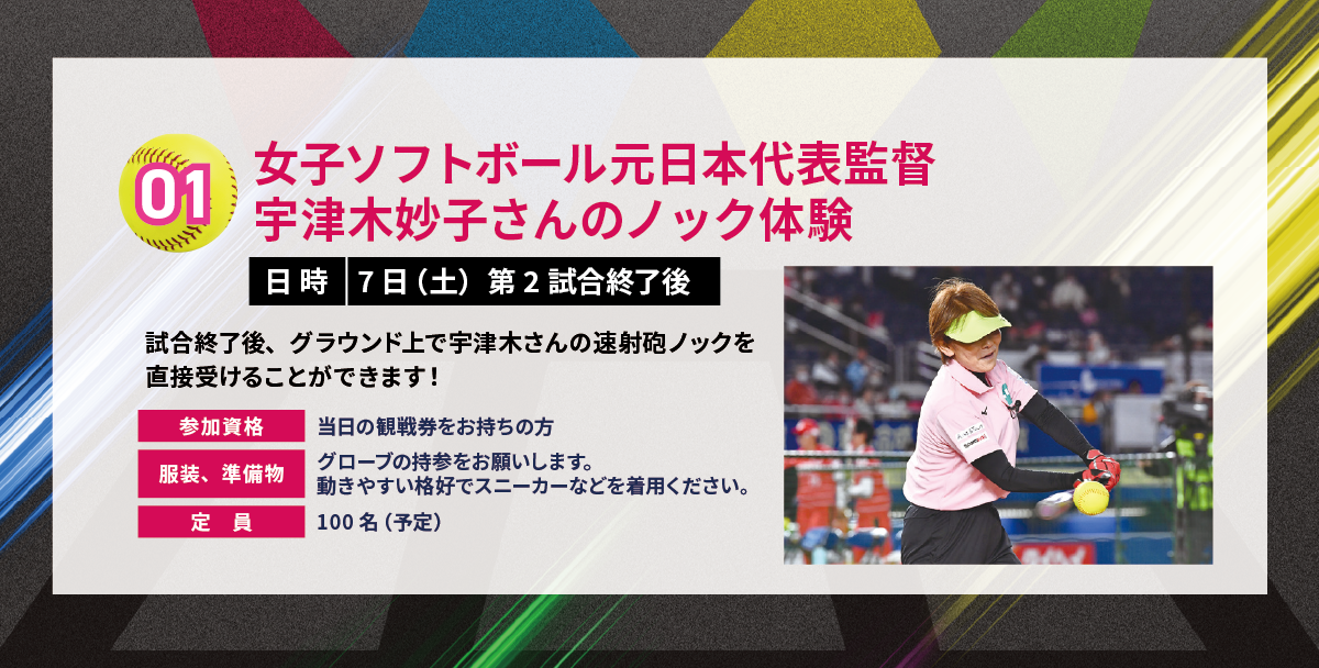 女子ソフトボール元日本代表監督の宇津木妙子さんによるノック体験イベントを開催いたします。
