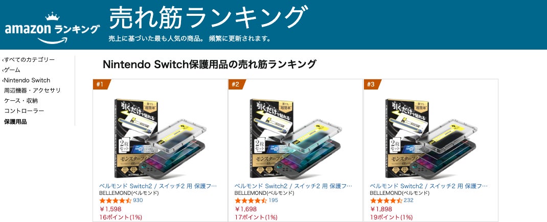 Fun Standard株式会社(株式会社RKB毎日ホールディングス グループ、本社:福岡県大野城市、代表取締役:大屋良介、笹森 広貴)が手がけるブランド BELLEMOND(ベルモンド) は、Nintendo Switch2専用画面保護フィルム「モンスターフィルム」が、発売直後より多くのお客様に支持され、Amazon内の関連カテゴリランキングで1位・2位・3位を獲得しましたのでお知らせいたします。