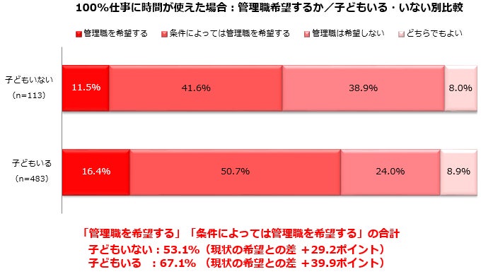 いまは管理職を“希望しない”女性が、100%仕事に時間が使えた場合はどうなるのか?「希望する」52.0%|現状の希望との差、お子さんがいる女性の方がより大きく