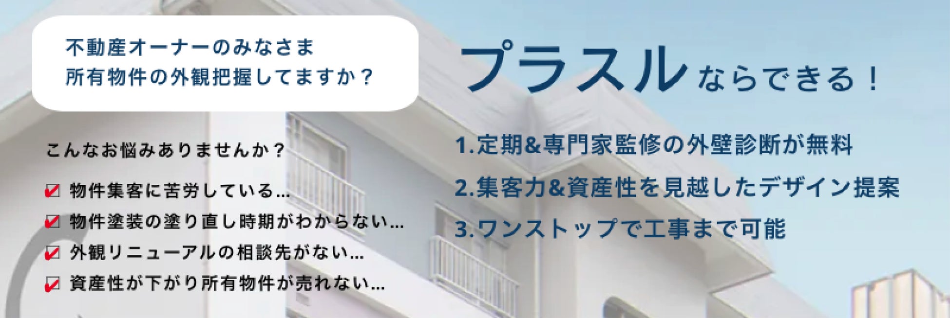 プラスルとは、外壁や外構にデザインを入れることで物件に価値をプラスする、クラスコが提供する賃貸管理会社向けの全国ネットワークです。これまでの外壁提案では、価格以外に競合他社との優位性を図ることができませんでしたが、プラスルならデザインをプラスすることによる物件価値の向上の観点で他社を上回ることができます。プラスルでは、外壁提案のもととなる外壁診断アウトソース化のための専用アプリや、外壁や外構のデザイン提供、賃貸オーナーへの提案ツール、ロゴ開発や3Dパースの提供など外壁工事受注のためのサービスをご用意しております。