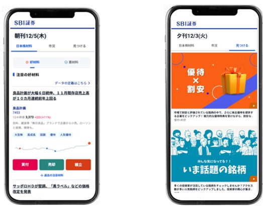 このたび提供を開始する投資情報サービスでは、「日本株材料」「市況」「見つける」の3つのタブに分けて、日本市場営業日の寄付前と引け後のタイミングで、当日の日本株の見通し・相場のまとめや、前営業日の引け以降に発表されたニュースをもとにした日本株の売買を判断する際の参考となる情報提供を行います。