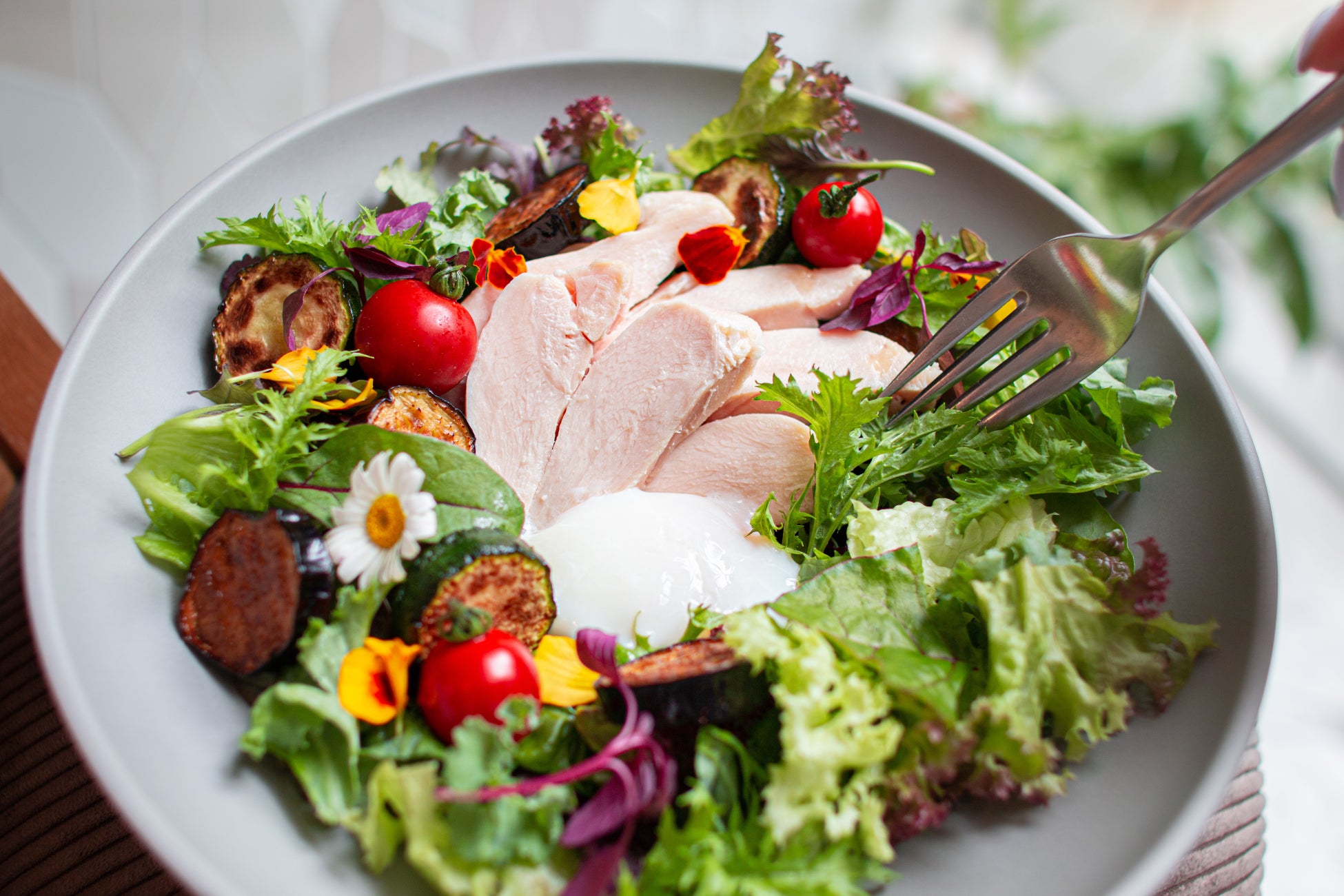 旬のトマト、ズッキーニ、茄子などの夏野菜に、しっとりと低温調理されたチキンをトッピング。味付けは夏らしくさっぱりとしたグァバドレッシング。