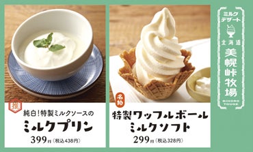 ⑥ミルクデザート 「北海道美幌峠牧場」貴重なグラスフェッドミルクを使用した「ミルクソフト」。北海道美幌峠牧場の乳牛は279ヘクタールの広大な自然の中でのびのびと放牧され、牧草だけを食べて育てられています。こだわりミルクのデザートをお楽しみください。・名物料理① 特製ワッフルボールミルクソフト 328円・名物料理② 純白!特製ミルクソースのミルクプリン438円