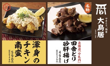 ①やきとり、鶏肴 「大鳥居」1986年創業からやきとり、鶏料理にこだわって参りました。さまざまな部位を一番おいしく食べていただきたいという想いから調理方法・味付けを研究しました。あなたのイチオシを見つけてください。・名物料理① 北海道「中札内」田舎どり砂肝揚げ 539円・名物料理② 渾身のチキン南蛮 649円