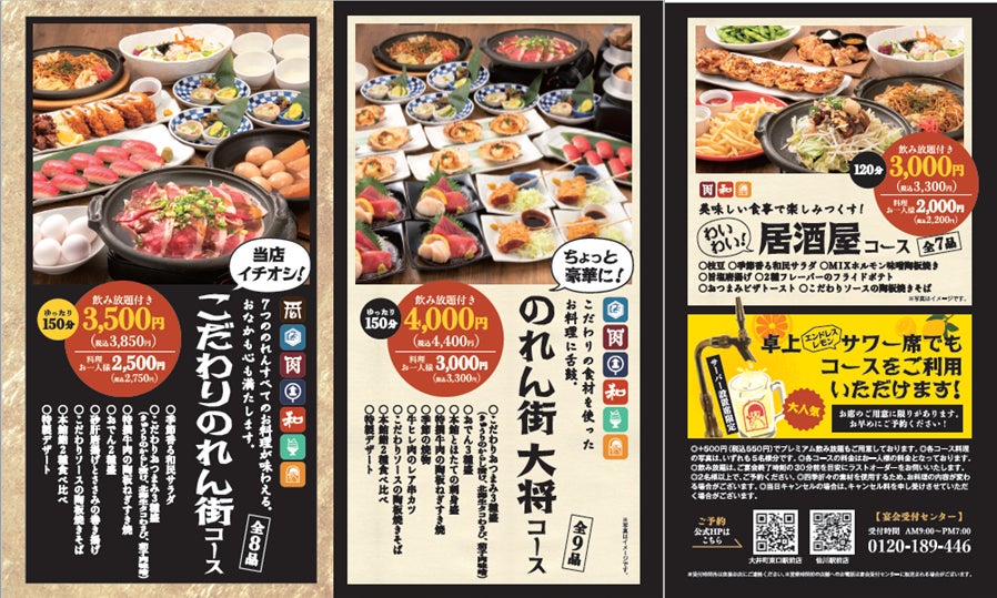 居食屋「こだわりのれん街」ではそれぞれのシーンに合わせて3種類の飲み放題付宴会コースをご用意しております。「わいわい!居酒屋コース」120分飲み放題付全7品 (税込3,300円)、「こだわりのれん街コース」150分飲み放題付全8品 (税込3,850円)、「のれん街大将コース」150分飲み放題付全9品 (税込4,400円)
