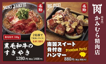 ③肉専門 「かみむら精肉店」精肉店ならではの料理を取り揃えました。サクッとジューシーに仕上げた揚げ物から焼き物、冷菜・サラダなど、様々な調理方法にこだわった、おいしい肉屋の味を是非ご賞味ください。・名物料理① 黒毛和牛のすきやき 1,408円・名物料理② 南国スイート骨付きハンマー 968円