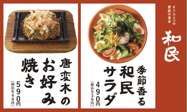 ⑤居食屋 「和民」「もうひとつの家庭の食卓」新しいタイプの居酒屋として1992年に誕生した居食屋「和民」。その懐かしい名物メニューを、当時の味付けで再現して「復刻」いたします。総合居酒屋の原点を感じていただけるお店です。・名物料理① 唐変木のお好み焼き 649円・名物料理② 季節香る和民サラダ 539円