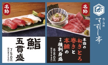 ②鮨と海鮮 「すしすし亭」厳選した本鮪。素材本来の旨味を鮨・刺身でご堪能ください。様々な魚介類を使用した寿司屋の肴は美味しいお酒とご一緒にどうぞ。・名物料理①本物のねぎとろ巻きと本鮪の2種刺身盛 968円・名物料理②鮨5貫盛 825円