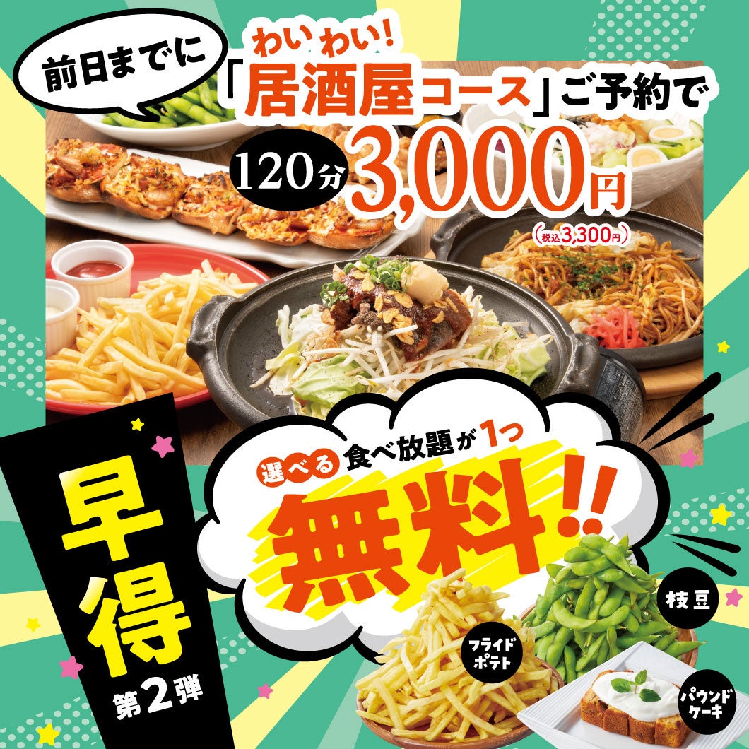 ■「わいわい!居酒屋コース(税込3,300円)」を前日までにご予約いただくと3つの食べ放題の中から一つ、無料プレゼントいたします。①枝豆食べ放題、②ポテト食べ放題、③パウンドケーキ食べ放題