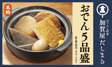 ④おでんと野菜 「加賀屋 だしまる」「加賀屋」総料理長監修の出汁を使い、野菜をよりおいしく食べられる。出汁を活かし、食材の味を際立たせたお料理にほっこり。どこか懐かしさを感じさせる、そんなお店。・名物料理 おでん5品盛 748円