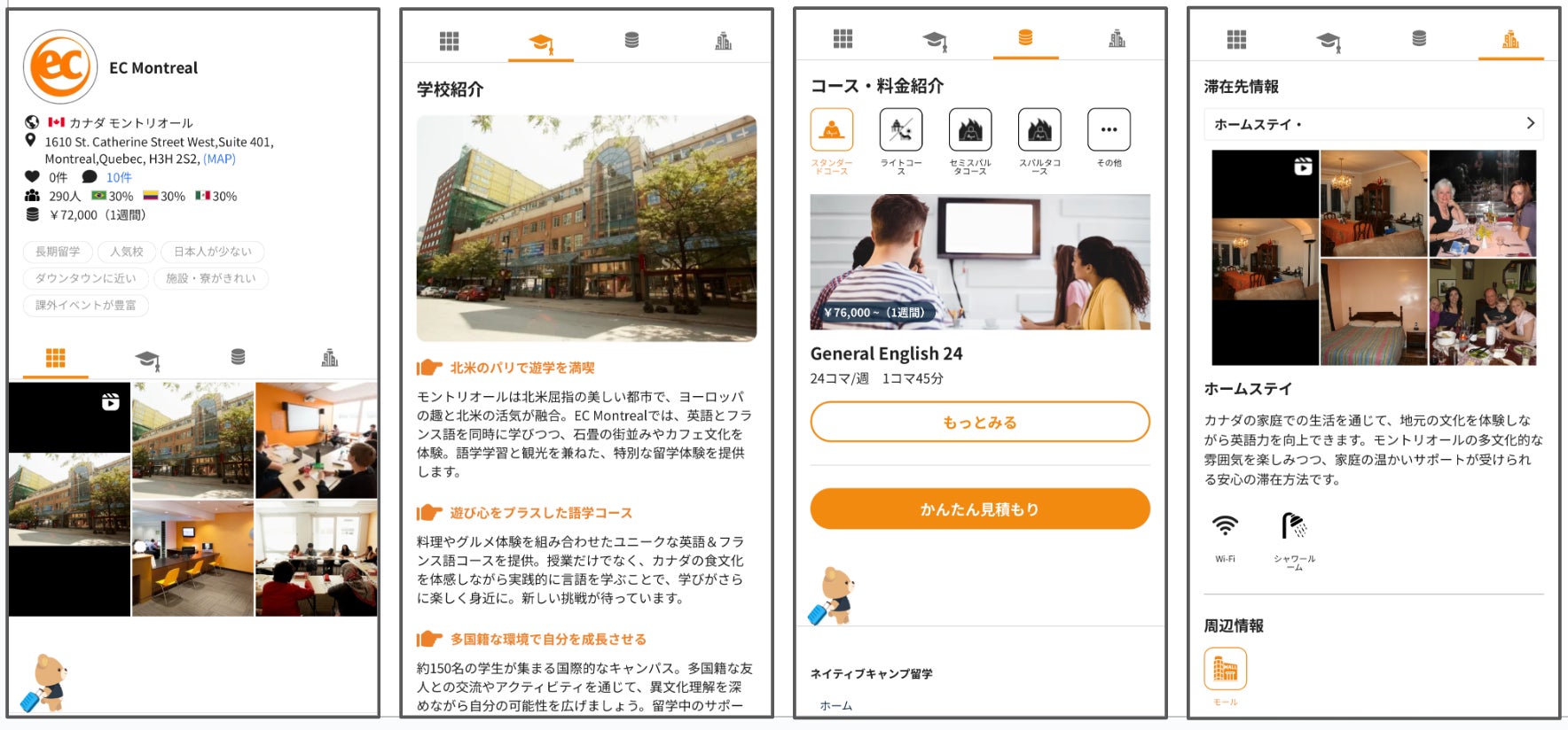 ネイティブキャンプ留学では、ユーザーが必要な情報を分かりやすく把握できるよう、常に丁寧で明確な情報提供を心がけています。EC Montrealの詳細情報は、以下の4つのカテゴリーに分けて掲載しており、知りたい情報を的確にお届けします。