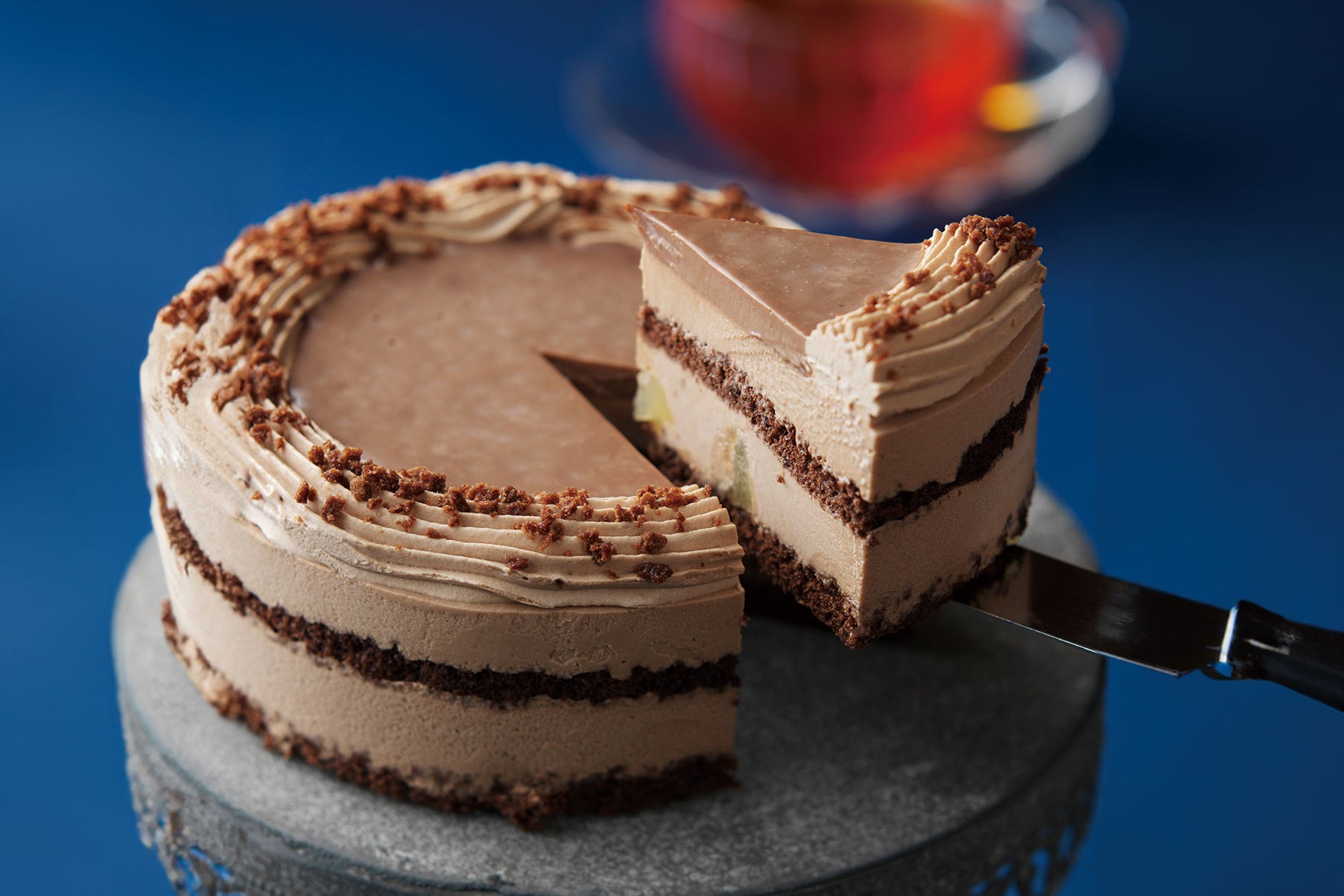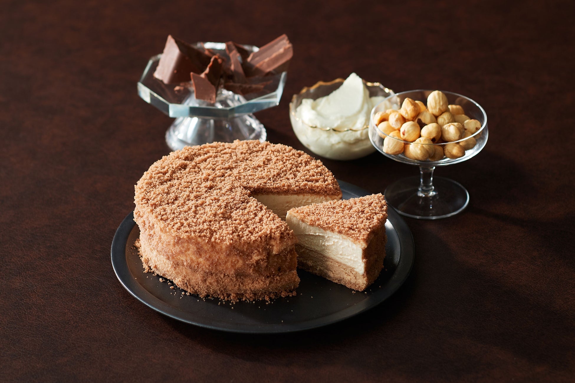 ヘーゼルナッツとチョコレートのコク深いベイクドチーズケーキに、ヘーゼルマスカルポーネムースを重ね、ミルキーでナッティな味わいが口どけとともに広がります。
