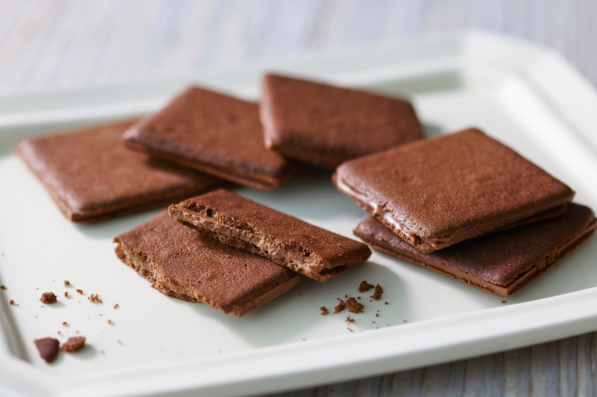 花のように芳しいダージリンの香りをチョコレートにまとわせて、サクサクの香ばしいココアクッキーでサンドしました。
