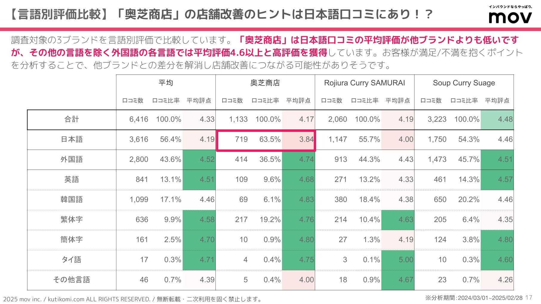 ■【言語別評価比較】「奥芝商店」の店舗改善のヒントは日本語口コミにあり!?