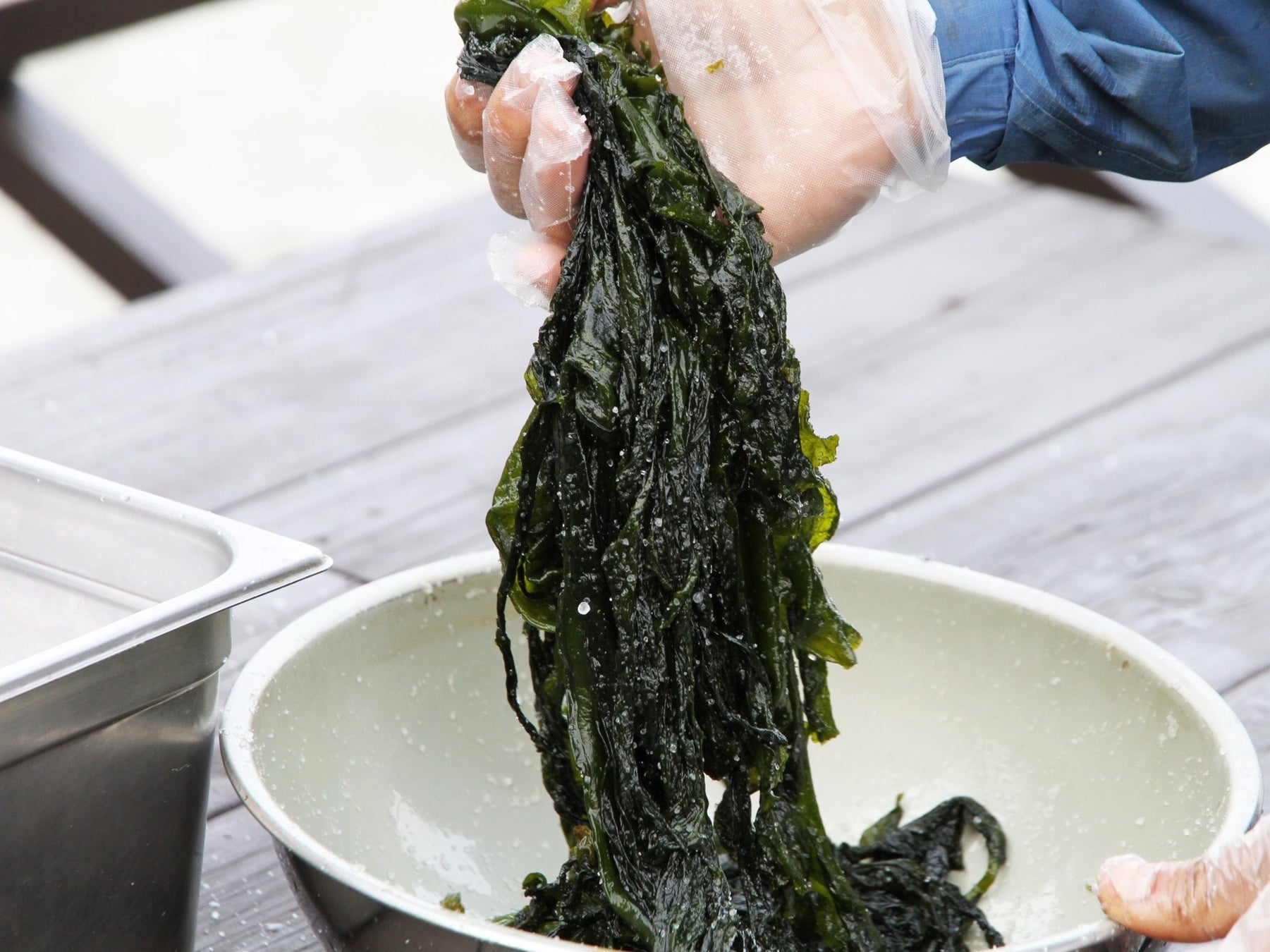 鳴門は、わかめの養殖ロープをつなげると1,048Km(なんと四国1周分!)になる一大産地。鳴門海峡の激しい潮流で育まれ、肉厚でシコシコした歯ごたえが特長です。たっぷりの塩を揉み込んで、わかめの水分を抜く“塩蔵加工”は、ギューッと力を込めると水分がどんどん出てきます。体を動かしながら楽しく体験でき、お子さまの食育にもおすすめです。