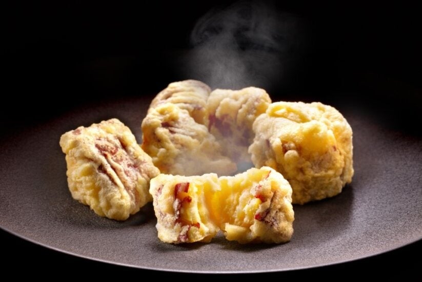 珍しいわかめの天ぷらは外がサクッ、中はしっとりした食感で、磯の風味あふれる人気の一品です。