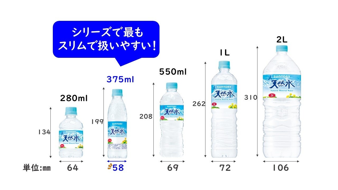 今回、「550mlではいつも少し余ってしまう」「ペットボトルは小さいカバンではかさばる」といった声を受け、広がりを見せるパーソナル容器へのニーズに対応するべく、“パーソナルコンパクト”の考え方の下、持ちやすく、カバンに入れても収まりやすいスリムな形状で、飲みきりに適した375mlサイズの「サントリー天然水」を発売します。