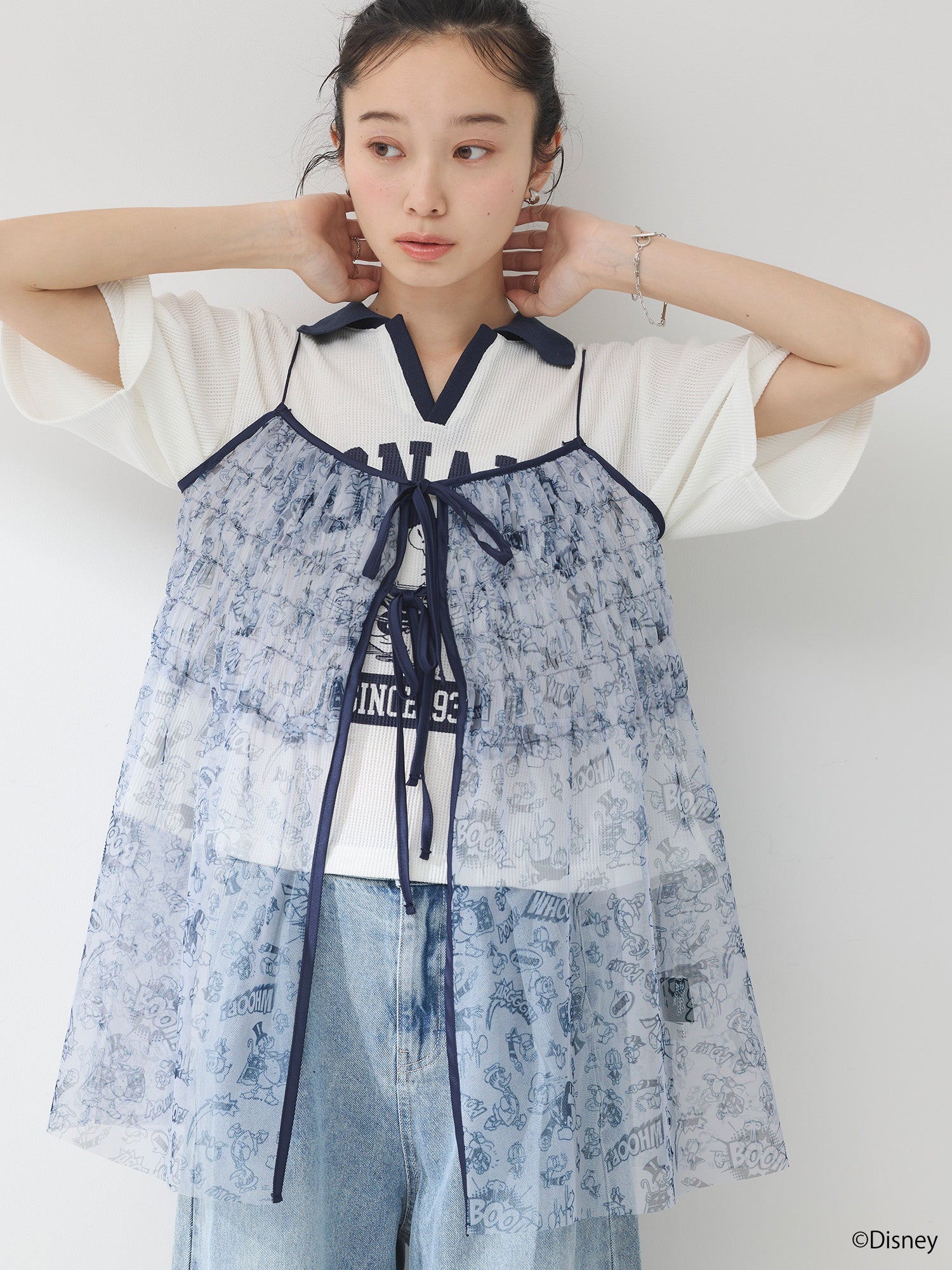 「ドナルドダック」のヴィンテージアートを使用した総柄のキャミビスチェは、チュール素材で夏らしい涼しげな印象に仕上げました。リボンやシャーリングなど、今季注目のディテールもポイントです。