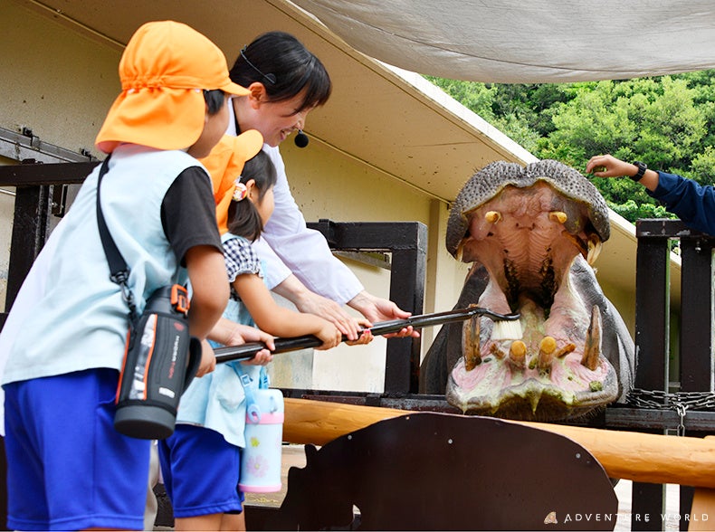 アドベンチャーワールド(和歌山県白浜町)では、6月4日(火)~10日(月)の「歯と口の健康週間」にちなみ、6月4日(火)に「カバの歯みがき体験&まるごとキャベツをあげてみたら観察会」を開催します。人間も動物も生きていくために食べることは欠かせず、歯と口内を健康に保つことが大切です。本イベントでは、地元の堅田保育園と堅田第二保育園の皆様に、大きな歯ブラシを使いカバの歯みがきを体験いただくほか、カバがキャベツをまるまる1玉食べる様子を飼育スタッフと一緒に観察します。さらに、歯の大切さを学んでいただけるよう、獣医師と飼育スタッフが動物の骨格標本を用いて、歯や口の役割についてレクチャーやクイズを実施します。