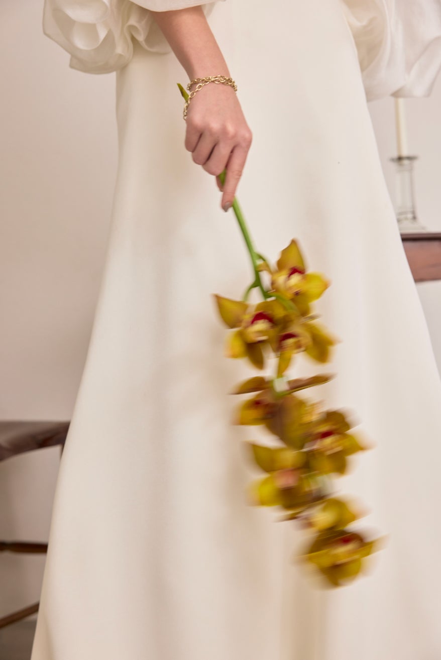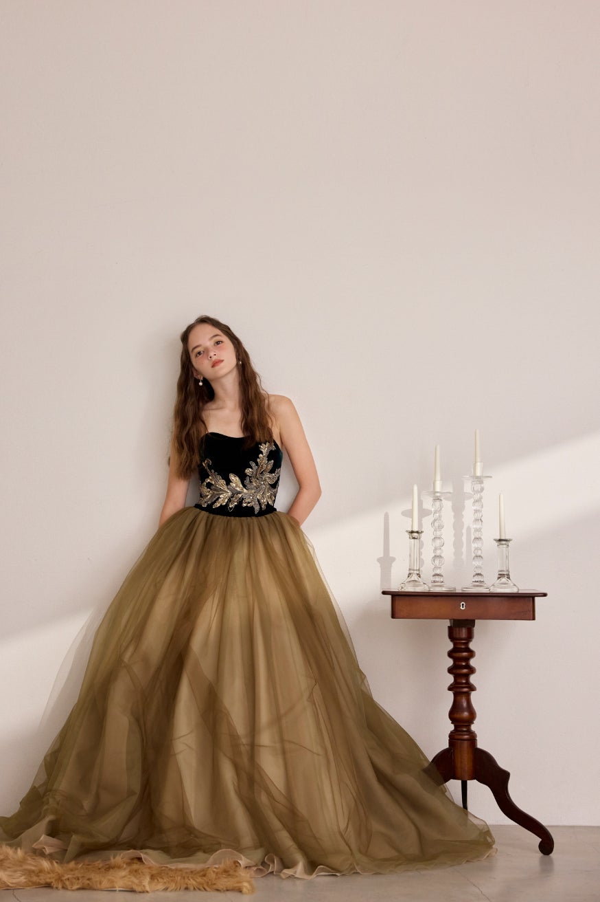 もう1着はオータムらしいモスグリーン×カーキチュールのボリュームドレス。