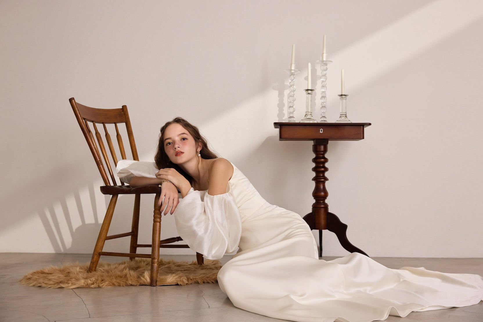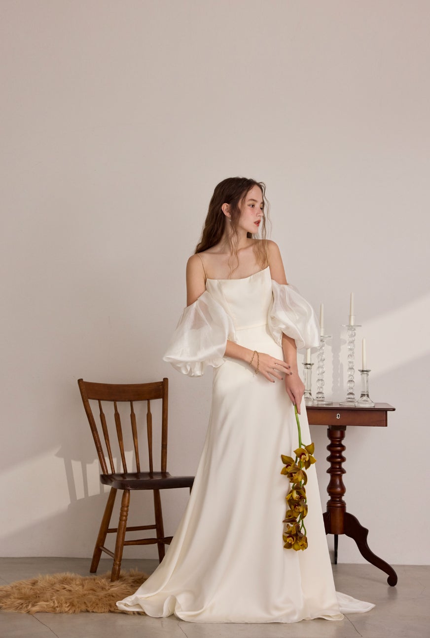 着用ドレスはスレンダーなウエディングドレスにパフスリーブを合わせたナチュラルなドレス。