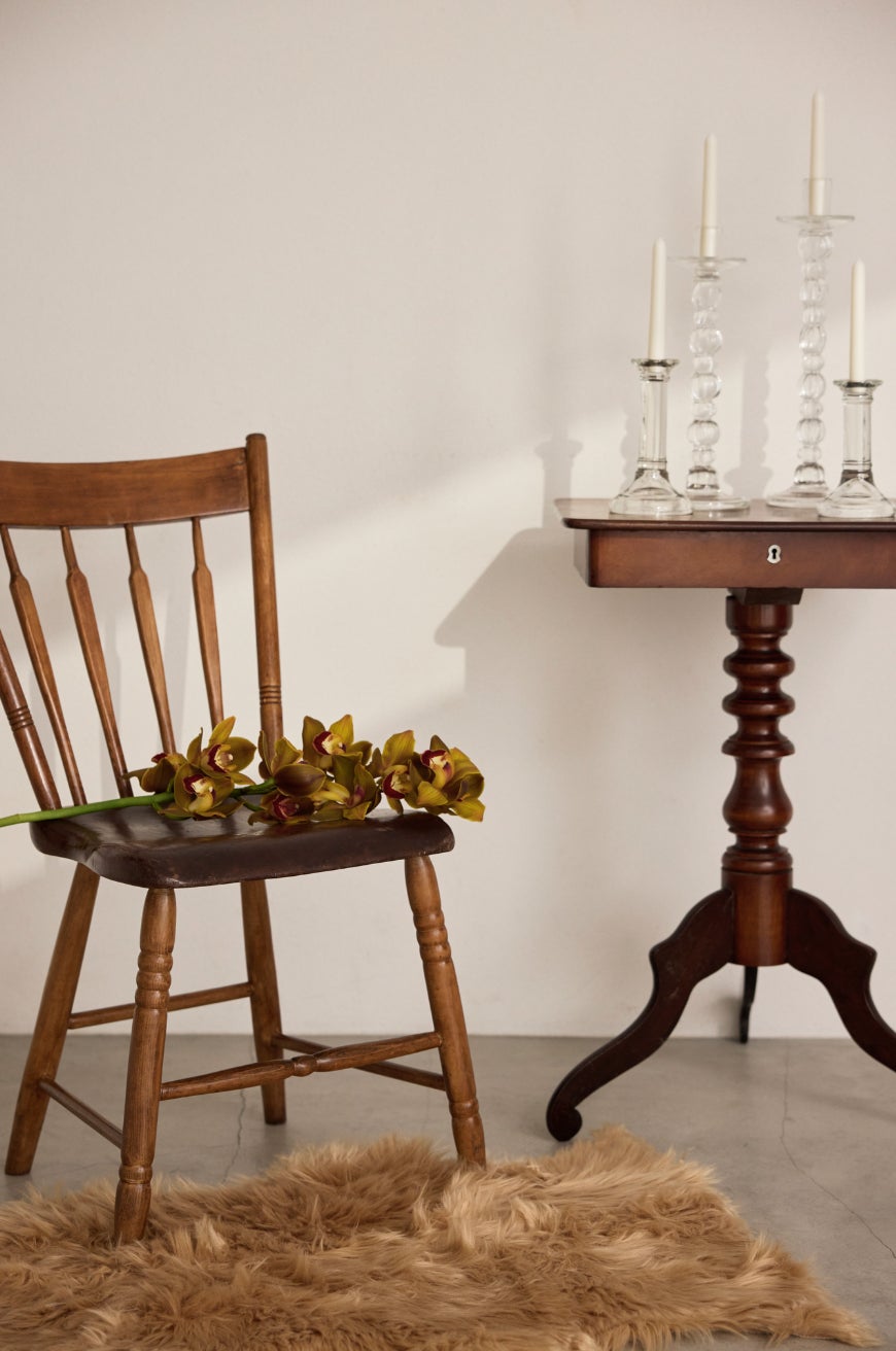 光の差し込む背景にて、アンティークインテリアを合わせた温かみのあるブラウンベースカラー。