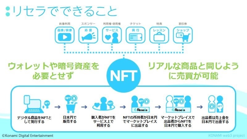 株式会社コナミデジタルエンタテインメントは、ブロックチェーン技術を活用したサービスをあらゆるお客様に提供するためのNFTマーケットプレイス「リセラ(Resella)」を、「東京ゲームショウ2023(TGS2023)」において発表しました。