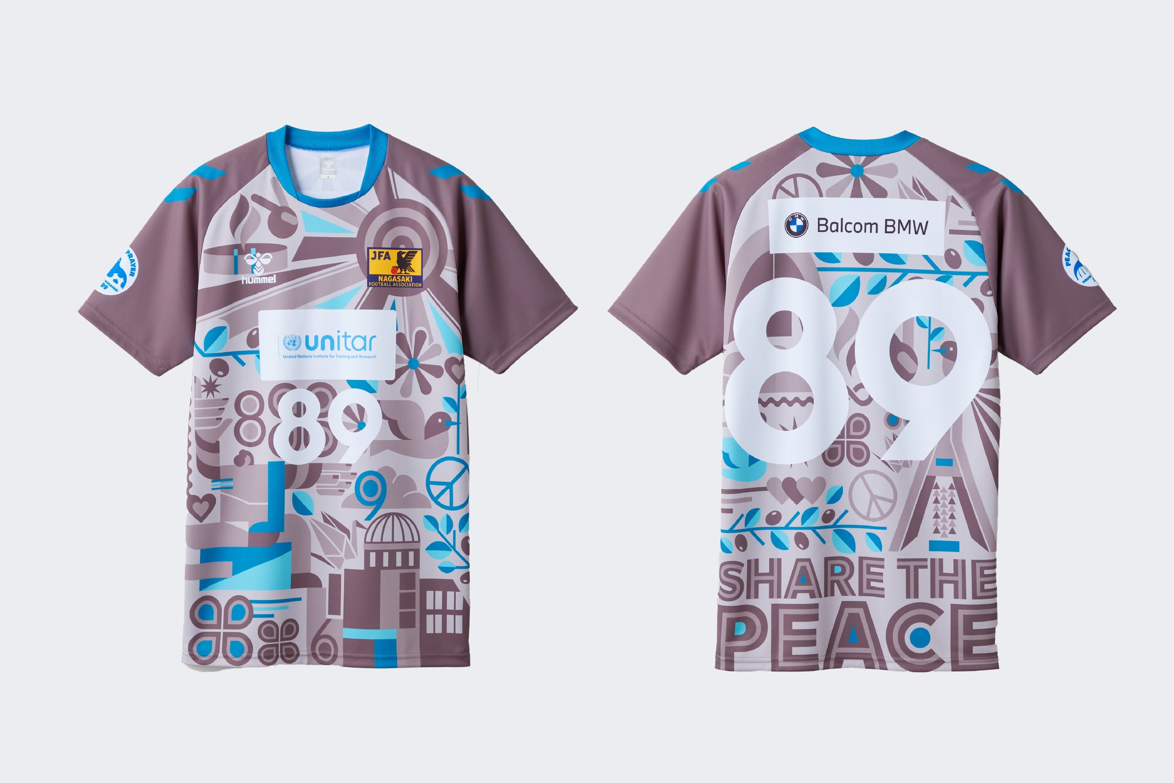 従来のピースユニフォームでも採用した広島県と長崎県の平和の象徴に加え、折り鶴や鳩、デイジーなど平和のモチーフを、シャツの全面にイラストで散りばめ、背面にはこの試合のメッセージでもある「SHARE THE PEACE」をプリント。未来を担う若者たちに、平和への感謝と讃えあう“PEACE”の精神を持ってほしい、“PEACE”な世界をつくってほしいという想いを込めました。