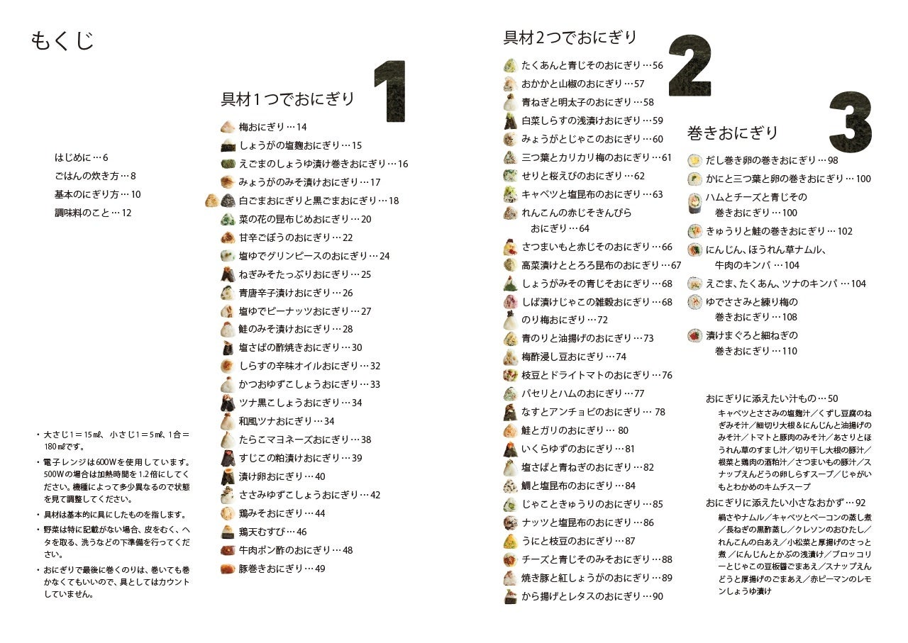 本書は、「具材1つでおにぎり」「具材2つでおにぎり」「巻きおにぎり」の3つのパートに分かれています。