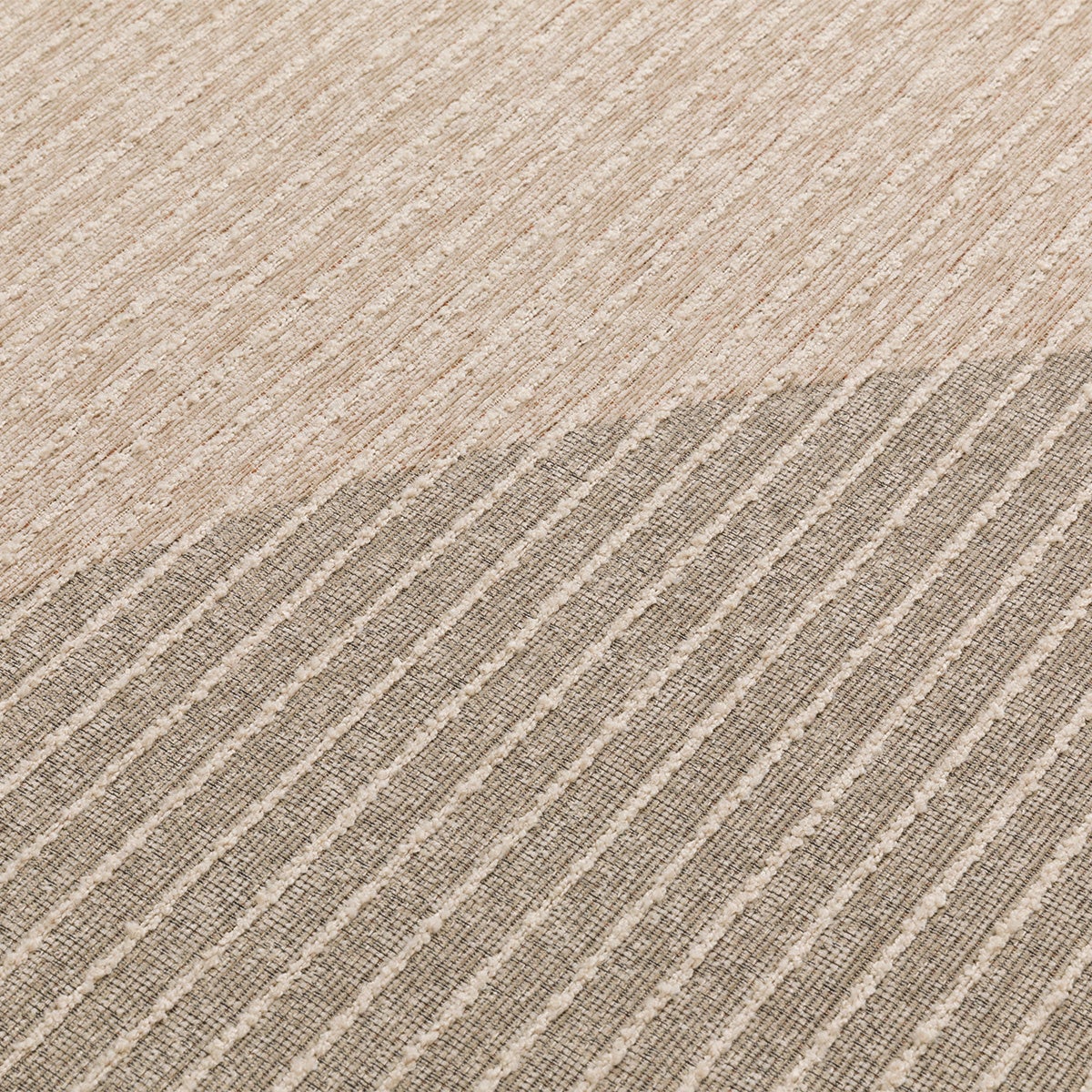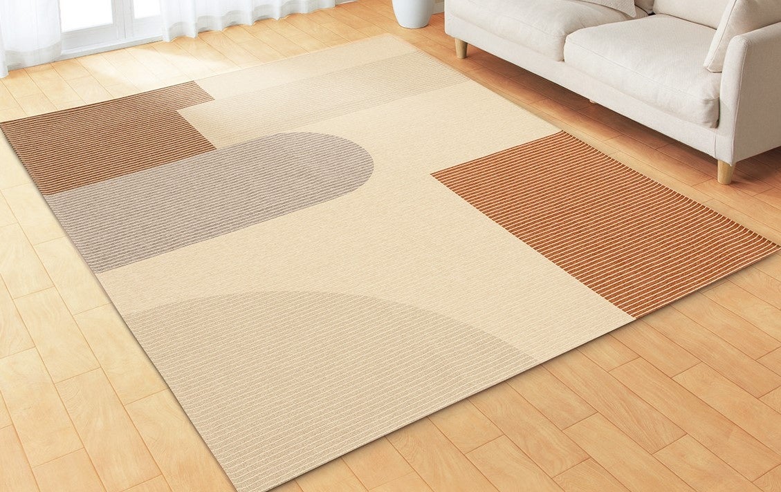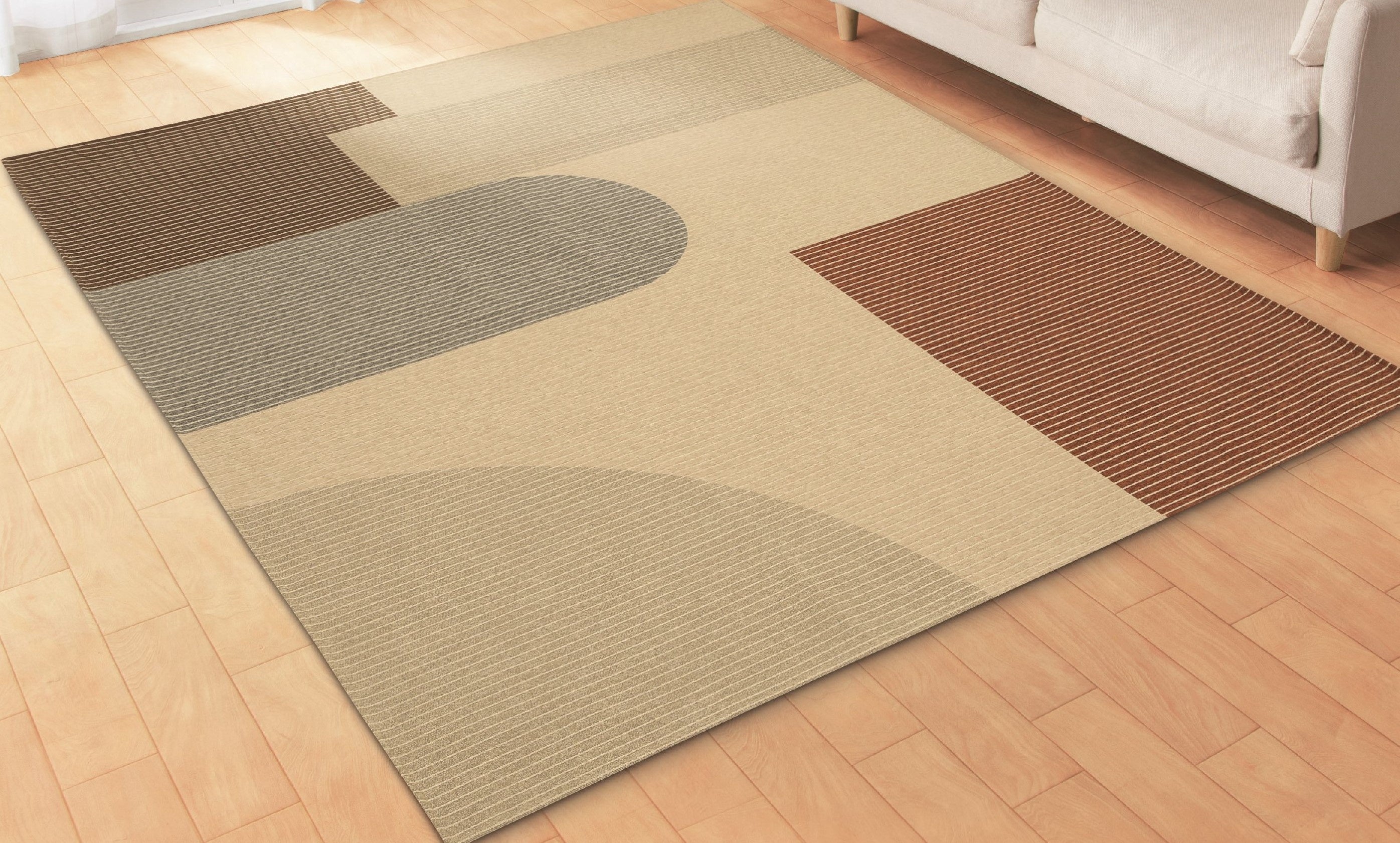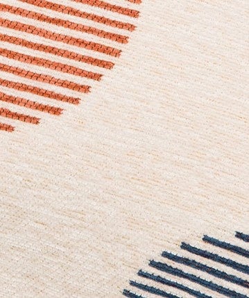 さらりとした肌ざわりでオールシーズン心地良い。曲線がユニークなストライプデザインで、この1枚を敷くだけでソファまわりの印象がガラリと変わります。