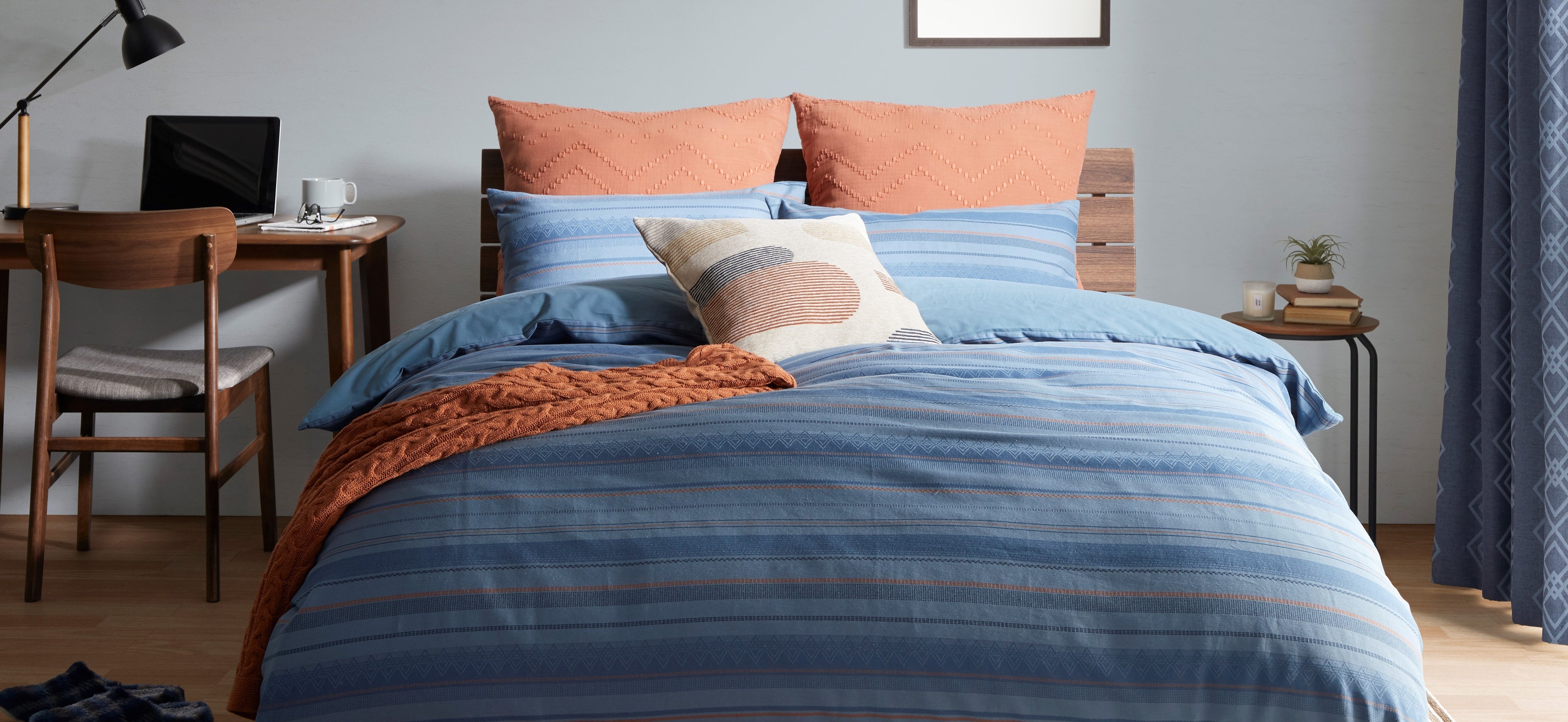 寝具カバーのアクセントカラーを使ったジャンボクッションが、ベッドまわりのコーディネートをワンランクアップ。 寝具カバーと同じコットン素材で、眠りの前のひとときをより快適にします。