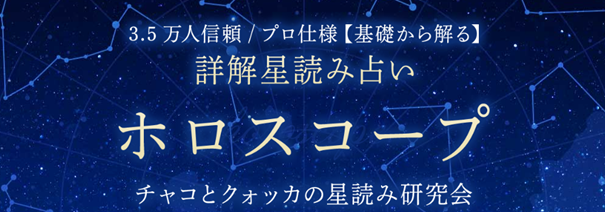 3.5万人から絶大なる信頼を得るチャコとクォッカの星読み研究会。初心者のみならずプロからも圧倒的な人気を誇る超本格派。あなたの性質や人生傾向、気になるあの人の本音や転機などホロスコープを優しく読み、丁寧に伝えます。基礎も応用も網羅した西洋占星術の決定版鑑定をご覧下さい。