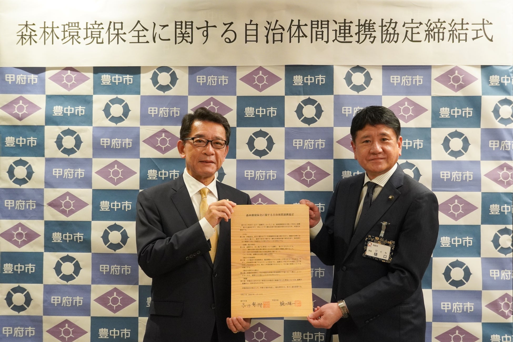 豊中市は、森林環境の保全に向け、山梨県甲府市と「森林環境保全に関する自治体間連携協定」を締結しました。