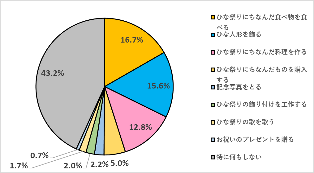 「ひな祭りで何をしますか?」という質問に対して、最多回答の「特に何もしない」を除き、最も多かったのは「ひな祭りにちなんだ食べ物を食べる」の16.7%でした。 また、「ひな人形を飾る」と回答された方が15.6%で、ついで「ひな祭りにちなんだ料理を作る」と回答された方が、12.8%という結果になりました。