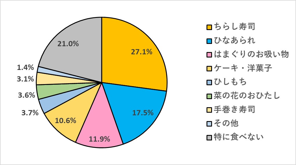 「ひな祭りに食べるものといえば何ですか?」の質問については、「ちらし寿司」27.1%が最多の回答となりました。ついで、「ひなあられ」17.5%、「はまぐりのお吸い物」11.9%となりました。(特に食べないを除く)