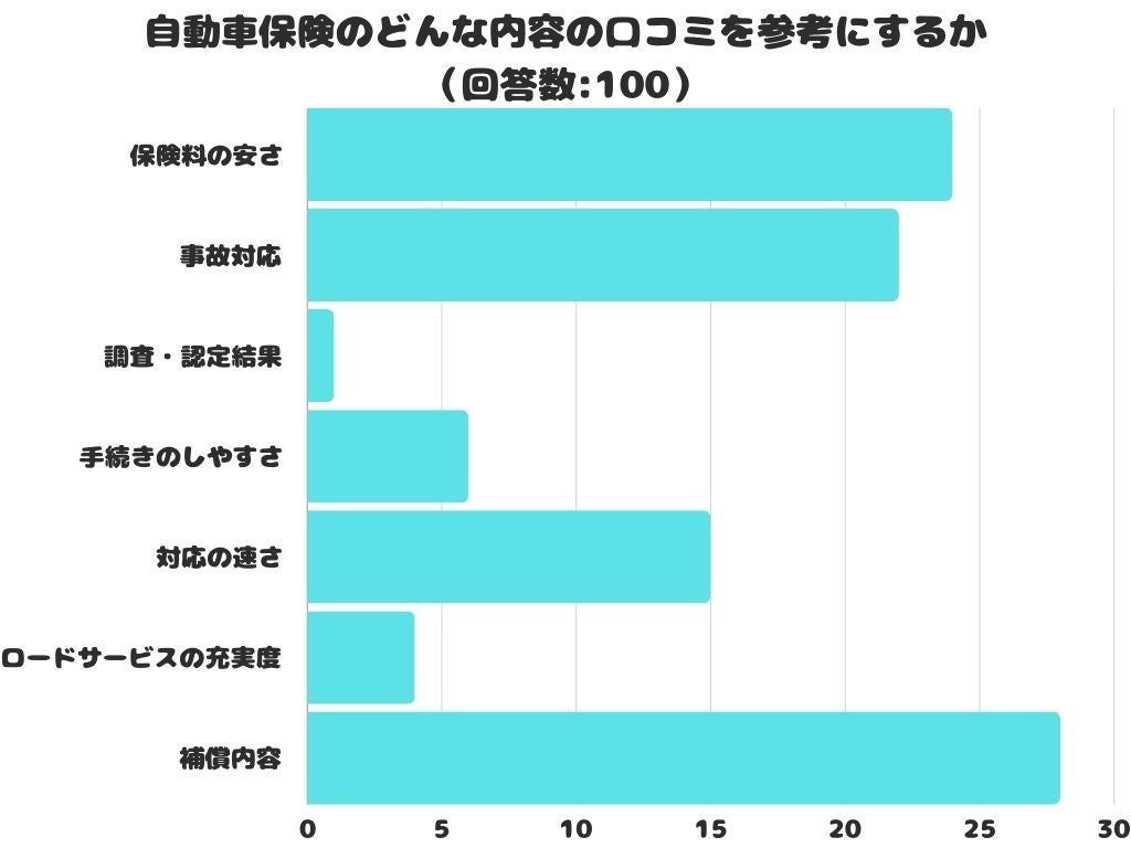 自動車保険のどんな内容の口コミを参考にするかをアンケートにて調査したところ、1位は「補償内容」でした。