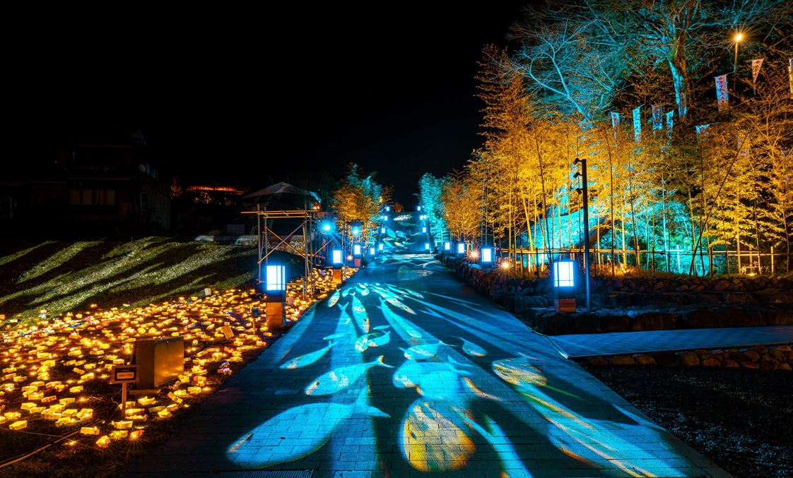 冬の長門湯本温泉で、温泉街を流れる音信川(おとずれがわ)を舞台に、長門市出身の童謡詩人「金子みすゞ」の詩をテーマにした灯りのイベント「音信川うたあかり」を実施しています。詩のナレーションに合わせた幻想的な光の演出「うたあかり幻燈輪舞(げんとうロンド)」や、市内の児童生徒が制作した数千個の「あかりのうつわ」を会場に設置します。長門湯本温泉の冬の風物詩「音信川うたあかり」での特別な風景をお楽しみください。