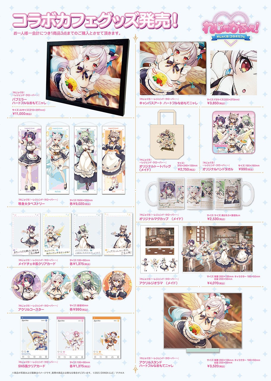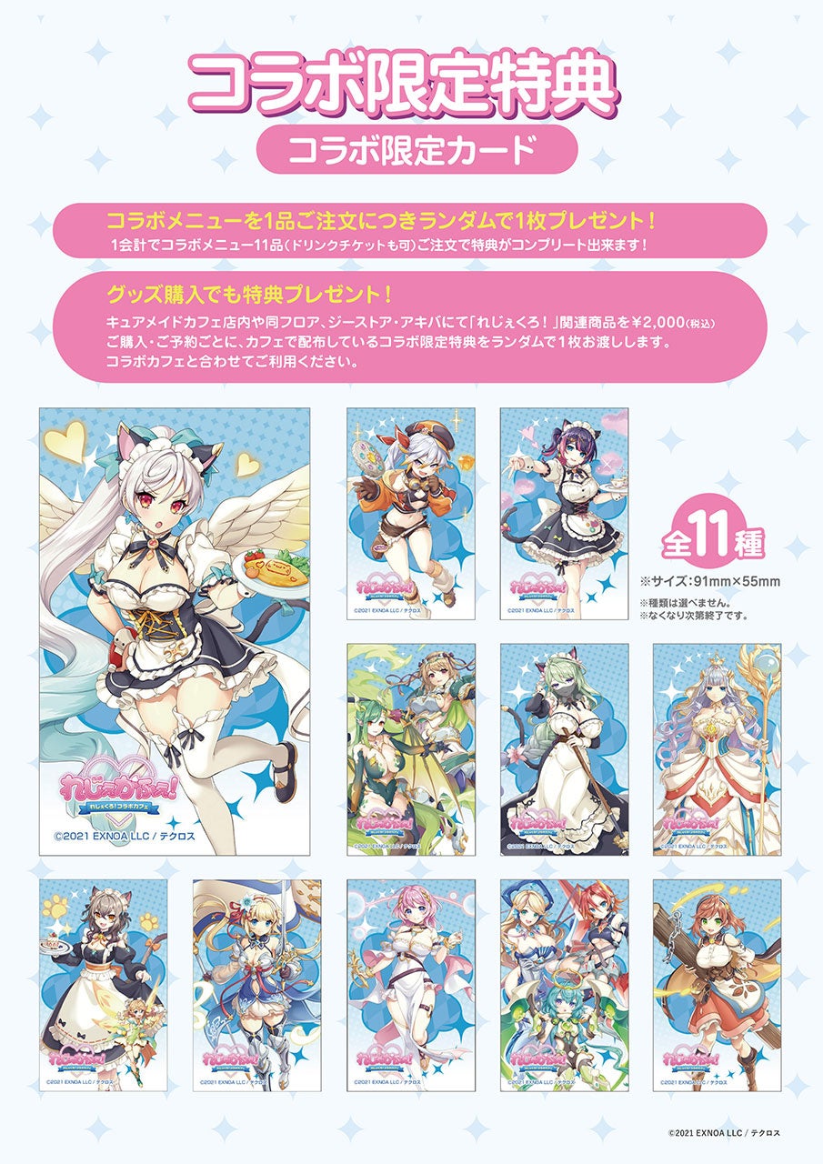 CURE MAID CAFÉ(キュアメイドカフェ)店内や同フロア、ジーストア・アキバにて「れじぇくろ!」関連商品を2,000円(税込)ご購入・ご予約ごとに、カフェで配布している【コラボ限定カード】をランダムで1枚お渡しします。コラボカフェと合わせてご利用ください。