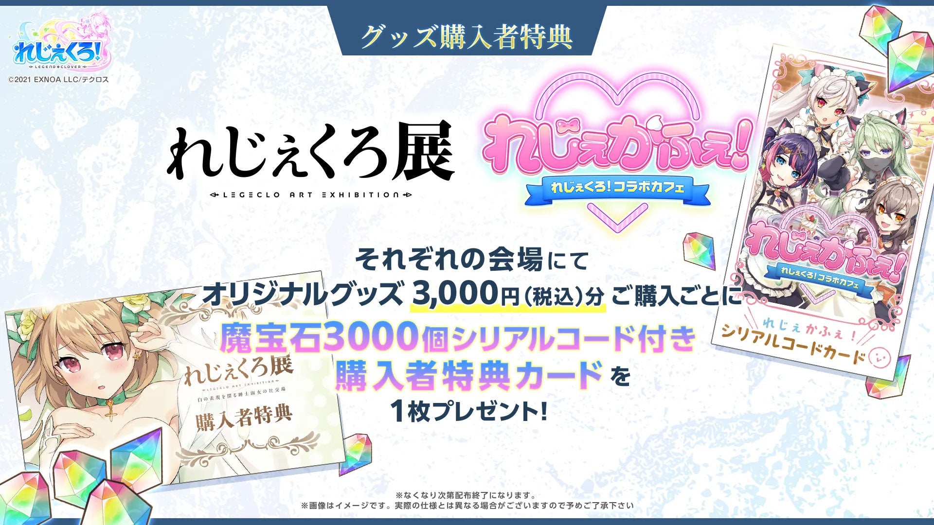 コラボカフェにて「れじぇくろ!」グッズを3,000円(税込)分ご購入ごとに「魔法石3000個シリアルコード付き購入者特典カード」を1枚プレゼントいたします。