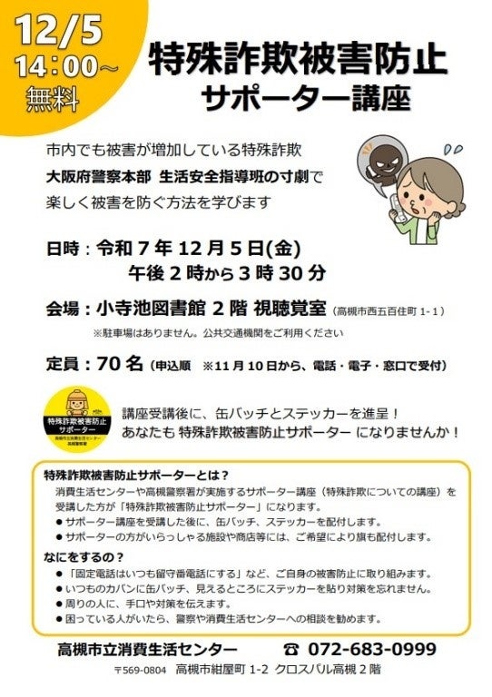 高槻市では、市民、事業者などの防犯意識を高め、地域全体で声掛けや見守り活動を行って特殊詐欺被害を防ぐため「特殊詐欺被害防止サポーター制度」を令和6年度から開始。これまで、延べ3200人以上の市民が講座を受講し、サポーターとして活躍しています。近年は若い世代を狙った詐欺被害も増える中、令和7年12月5日(金曜日)には、市立小寺池図書館で「ニセ警察」や自動音声電話など最新の手口や防止策を学べる講座が開催されます。