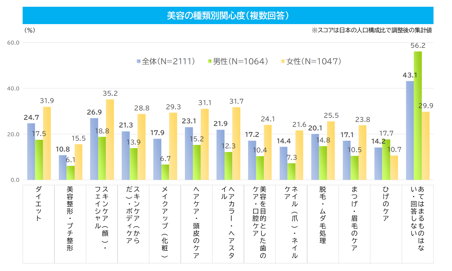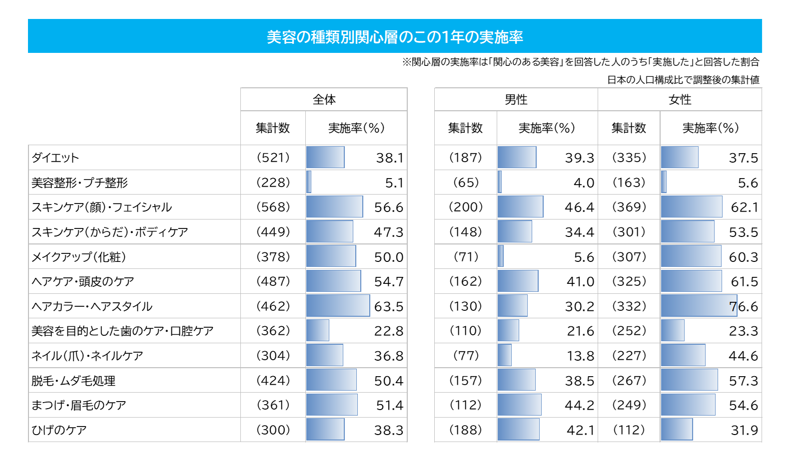 種類別では「ヘアカラー・ヘアスタイル」の実施率は63.5%と最も高くなりましたが、男女別で見ると女性で76.6%、男性で30.2%と大きな差があります。男性の場合は、髪に関する美容では「ヘアケア・頭皮のケア」の方が関心度、実施率ともに「ヘアカラー・ヘアスタイル」よりも高い結果となっています。