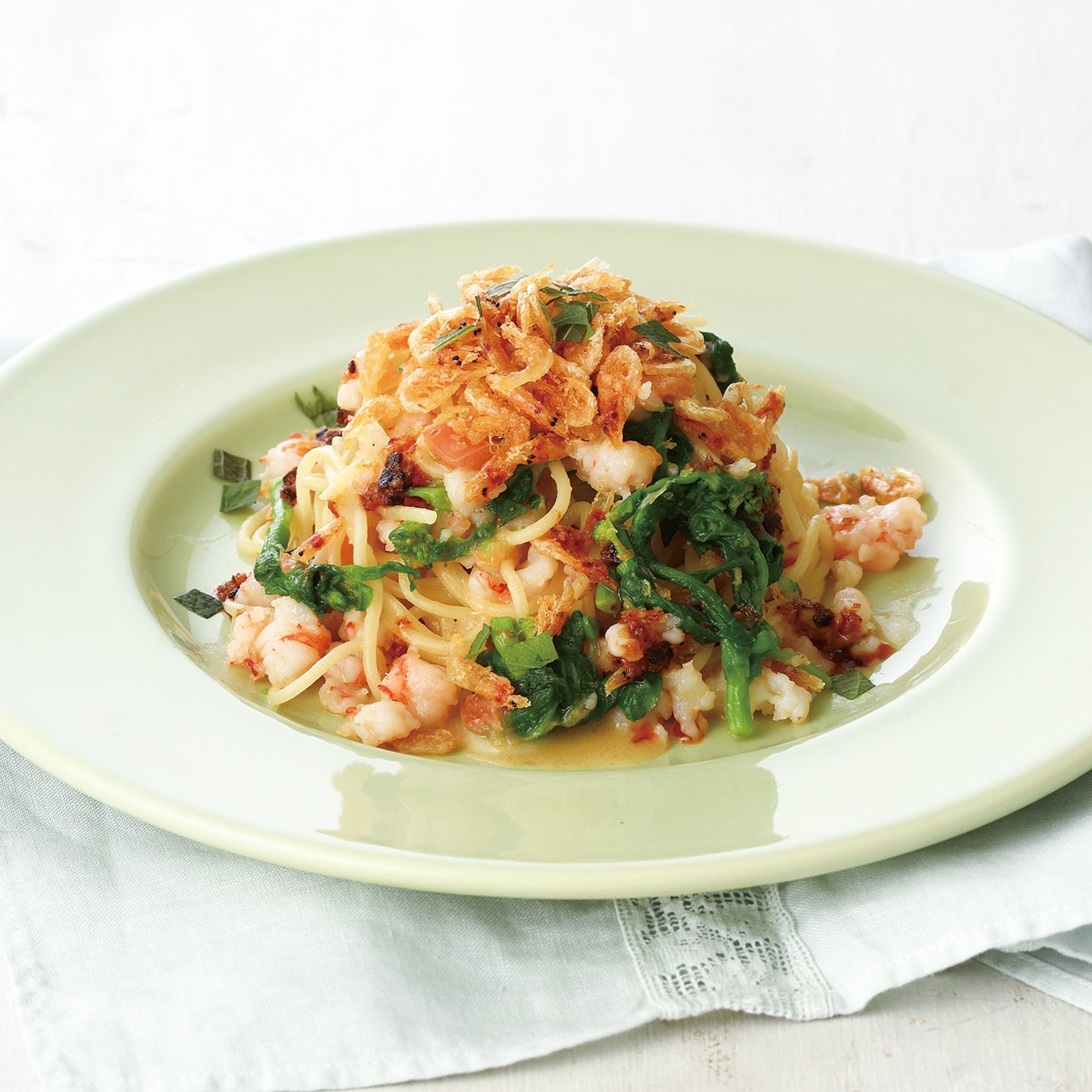 海老の桜色と菜の花のグリーンで、春らしい彩りのパスタに仕上げました。カリッと揚げた桜海老と、叩き海老のプリプリ食感もお楽しみください。