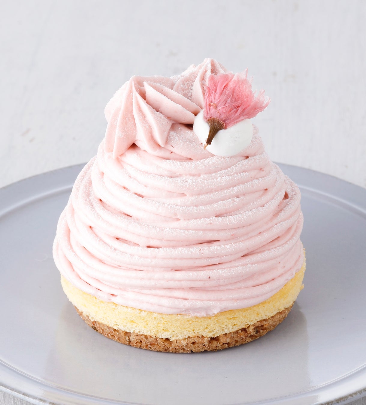 まろやかな白あんミルクムースの上に、ほんのり桜が香る口どけのよいバタークリームを絞った桜色のモンブラン。白あんミルクムースの中心には、梅と苺のジュレを入れ、さっぱりとした酸味がアクセント。土台には、桜の葉の刻みを混ぜ込み、全粒粉を配合したシュトロイゼル※のザクザクとした食感と桜の葉の香りが楽しめます。