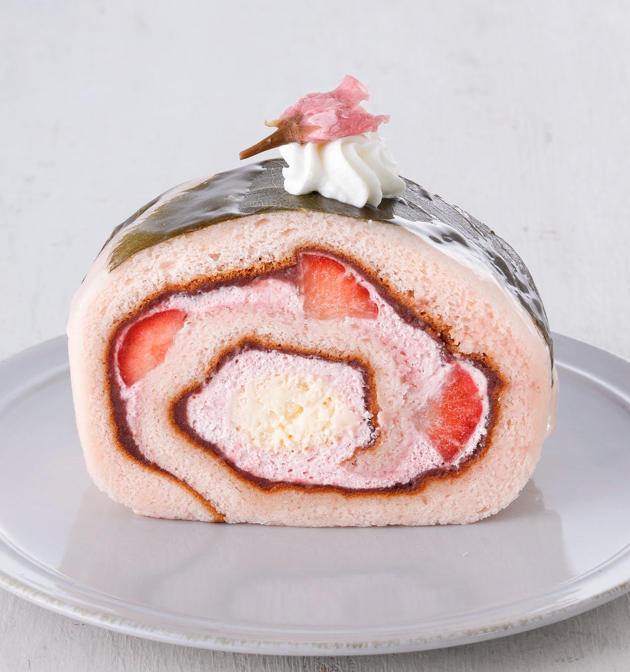 桜がふわっと香る苺クリームとさわやかなレアチーズムースを、ラズベリーの濃縮果汁でピンク色にしたスフレ生地で巻き上げました。塩漬けにした桜の花と葉がほんのり香り、隠し味にブランデーを加えたこしあんのやさしい甘みとともに春の訪れを感じる味わいに。