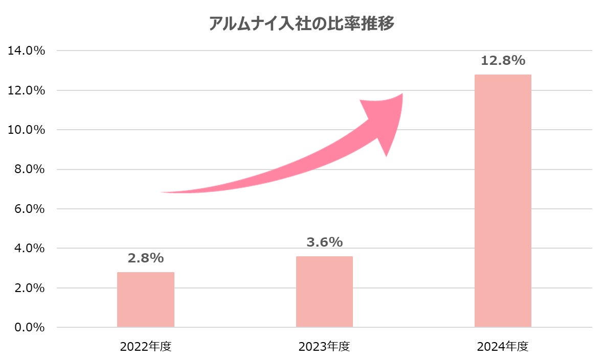 結果として、2022年度のアルムナイ入社者の割合は2.8%でしたが、2024年度には12.8%に達し、約4.6倍に増加しました。