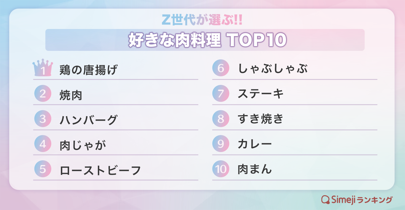 【Simejiランキング】Z世代が選ぶ!!「好きな肉料理TOP10」
