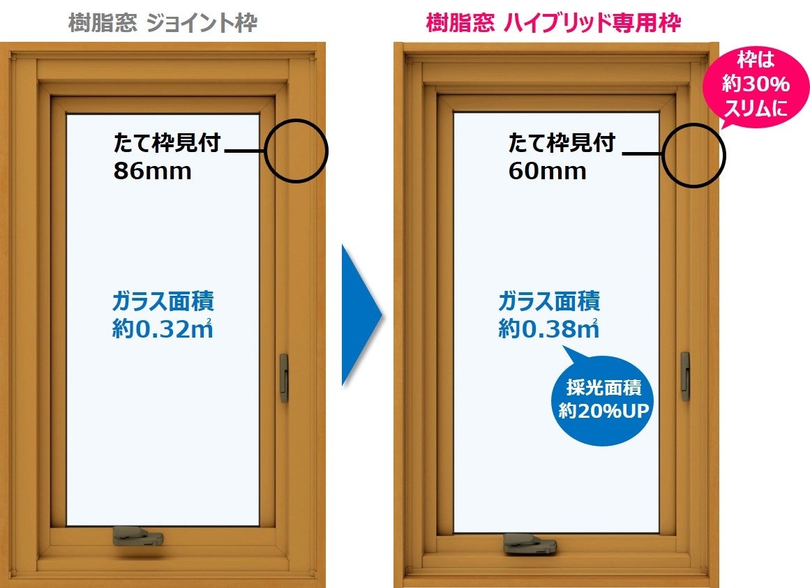 ■ハイブリッド専用枠で見付をスリム化し、採光面積が約20%アップすることで、すっきりとした意匠性を実現