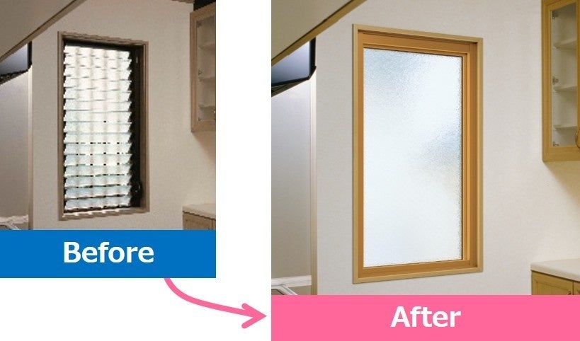 従来の「マドリモ 戸建用」樹脂窓 ジョイント枠では、ストック住宅のプロジェクト窓に多い幅や高さのサイズが小さい窓に対応ができませんでしたが、ハイブリッド専用枠になることで幅が40センチ程度の小さいサイズにも対応できるようになります。ストック住宅の洗面所やキッチンなどの水回り空間に多用されたガラスルーバー窓(※3)は、換気能力に優れている反面、断熱性能が悪く、すき間風や砂ぼこりが入るといった困りごとを抱えている窓種です。今回の新商品では既設の窓がガラスルーバー窓などで多い幅が小さい窓にも対応ができるため、断熱性や気密性の高い樹脂窓に交換することで快適性をより感じていただけるアイテムです。