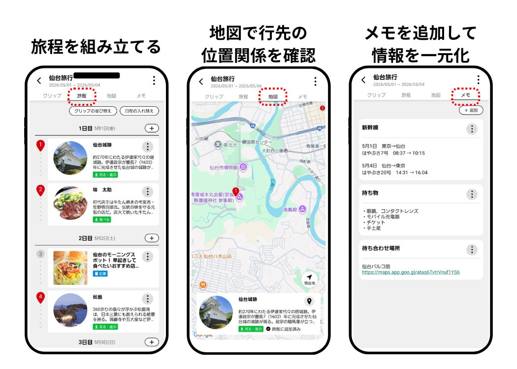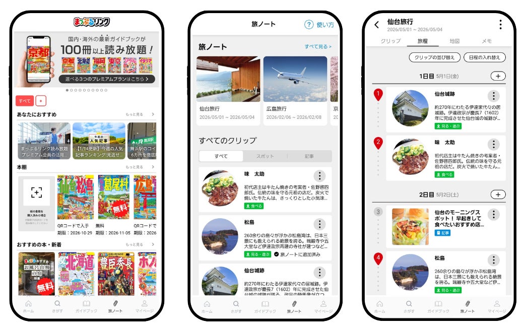 今回の新機能「旅ノート」により、まっぷるリンクは「情報を集めるアプリ」から「旅の計画をつくるアプリ」へと進化します。 ガイドブックや記事で見つけた「行きたい場所」をクリップし、地図上で位置を確認しながら無理のないスケジュールを組み立てる。情報収集から旅程管理までをひとつのアプリで完結させることで、よりスムーズで楽しい旅の準備をサポートします。